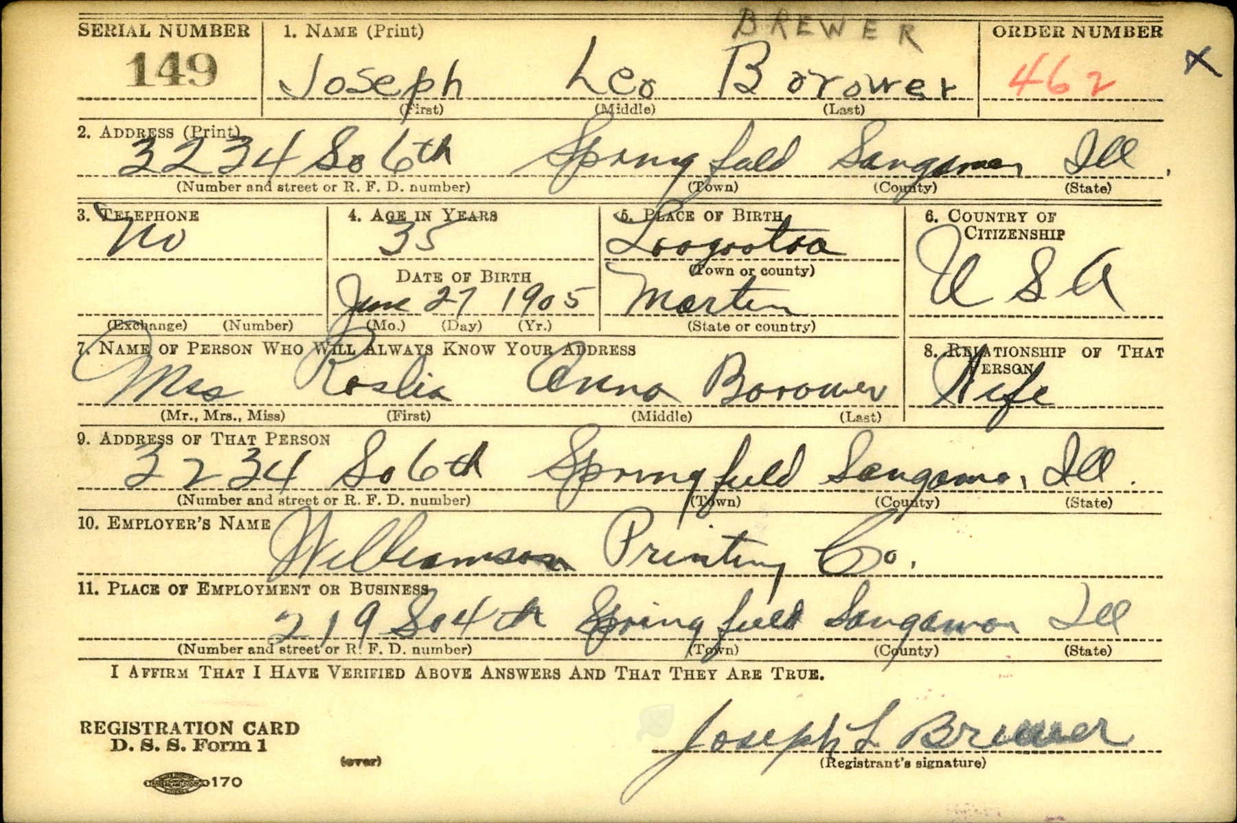 Joseph Leo Brewer, Serial Number 149, Order Number 462